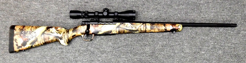 Preowned, Very Good Condition, Mossberg Patriot Bolt-Action Rifle, .243 Win., 22″ Fluted Barrel, Spiral-Fluted Bolt, 4 Rounds, 1 Magazine, Mossy Oak “Deer Thugs” Camo, Generic 3-9X40 Scope: Sold