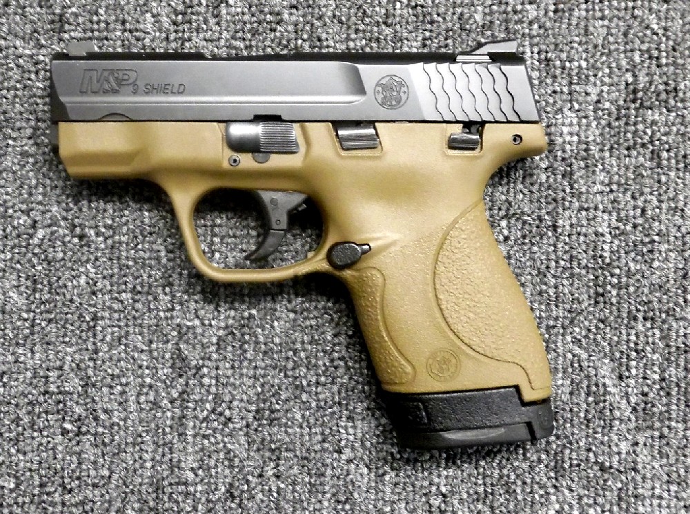 Preowned, Excellent Condition, Smith & Wesson M&P Shield, 9mm, 3.1″ Barrel, 7 & 8 Rounds, 2 Magazines, FDE Finish, White-Dot Sights, External Safety: Sold2025-11-14T11:18:11-05:00