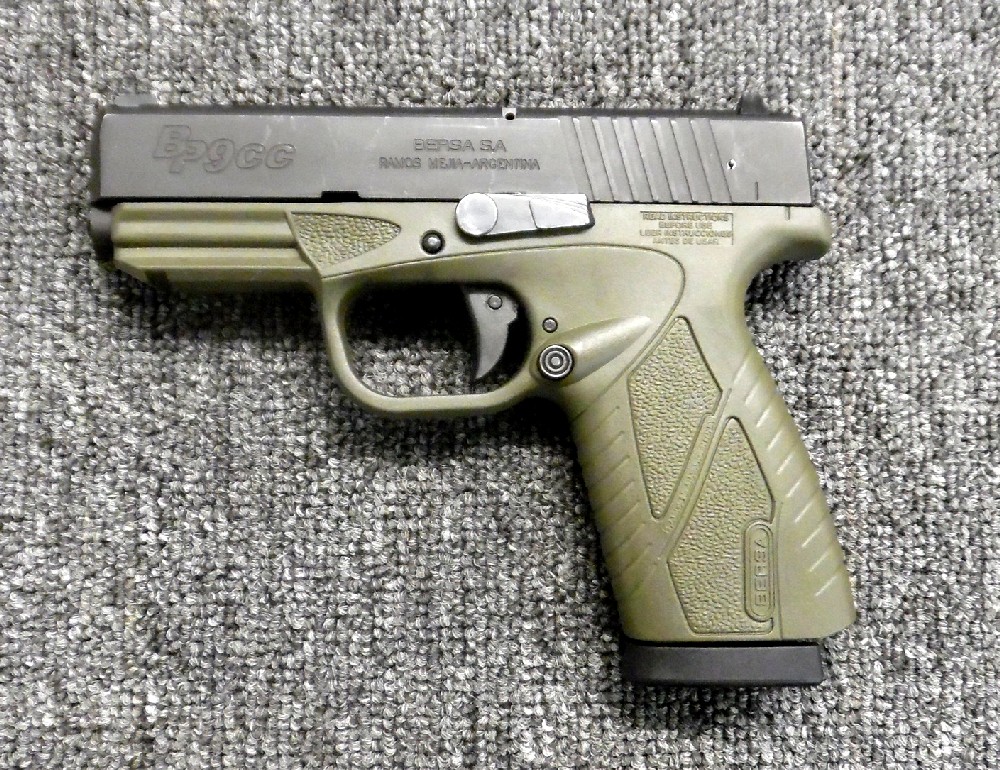 Preowned, Very Good Condition, Bersa BP9CC Compact Pistol, 9mm, 3.4″ Barrel, 8 Rounds, 2 Magazines, White-Dot Sights, OD Green: Only $229!2026-02-04T08:46:12-05:00